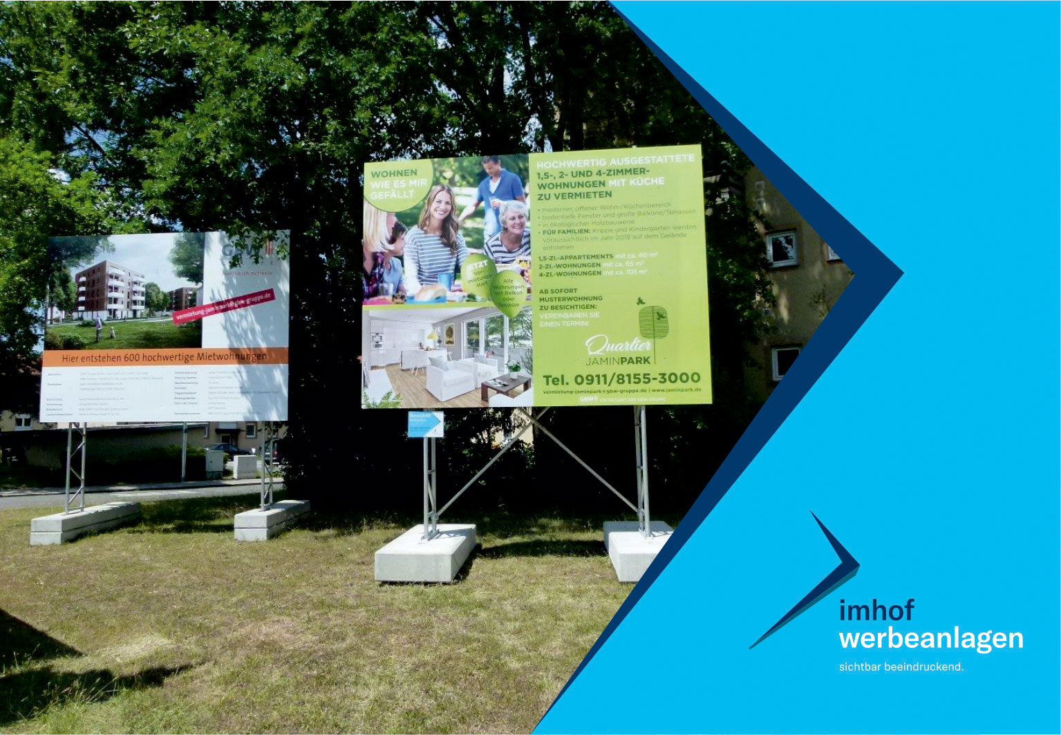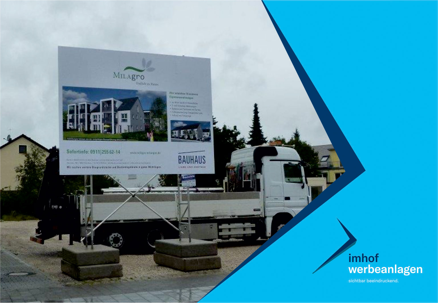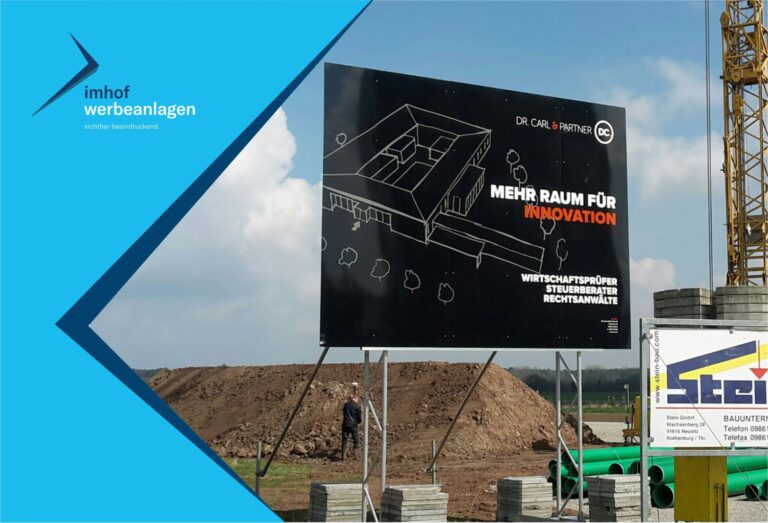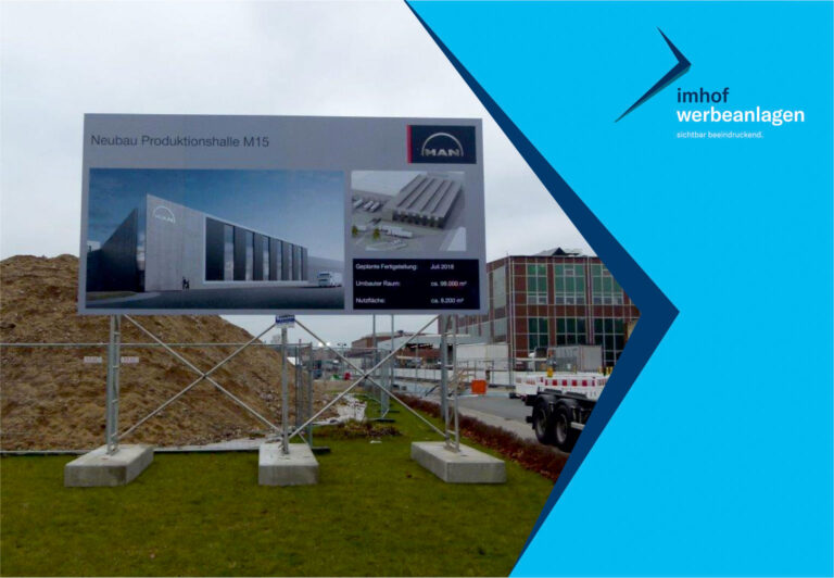 Sicherheit ist uns – und Dir – wichtig: Wir möchten, dass ein Bauschild, das wir für Dich erstellen, alle erforderlichen sicherheitsrechtlichen Anforderungen erfüllen. Das gehört selbstverständlich zu unserem professionellen Anspruch. Wir liefern Dir grundstabile Bauschilder mit eigener Typenstatik-Berechnung auf massiven Betonfundamenten. Unsere Tafeln selbst bestehen aus Aluverbundplatten, die wir Dir auf einem Alugerüstsystem montieren. Die Anmutung wirkt robust, stabil, modern und einheitlich. Produktion und Lieferung in Time mit deutschlandweitem Montageservice garantieren wir Dir on top . Serviceleistungen von Imhof Werbung in Nürnberg.